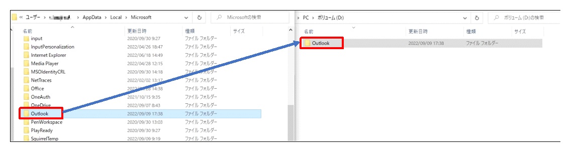 ⇒C:\Users\ユーザー名\AppData\Local\Microsoftフォルダにある「Outlook」フォルダを移動する。